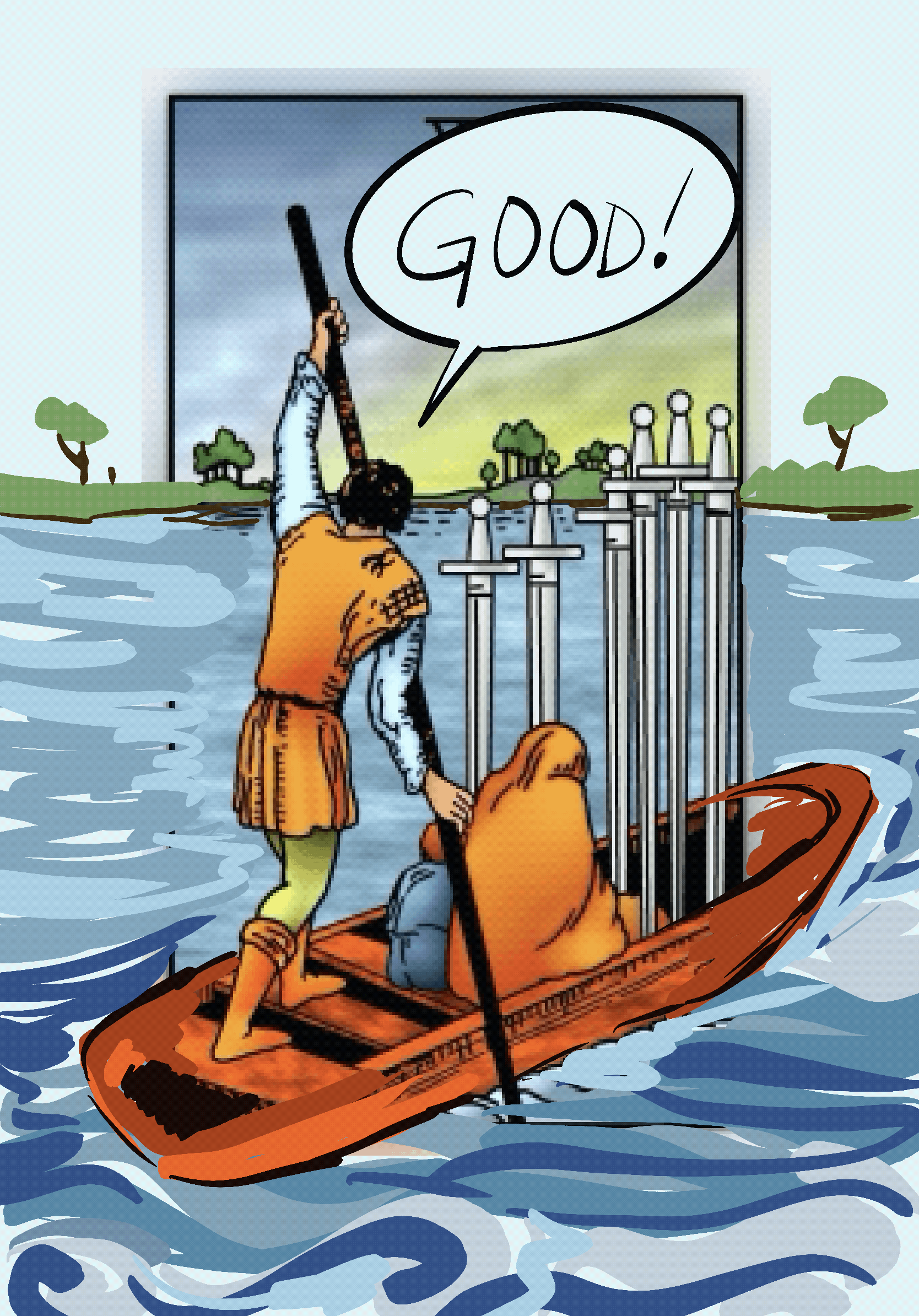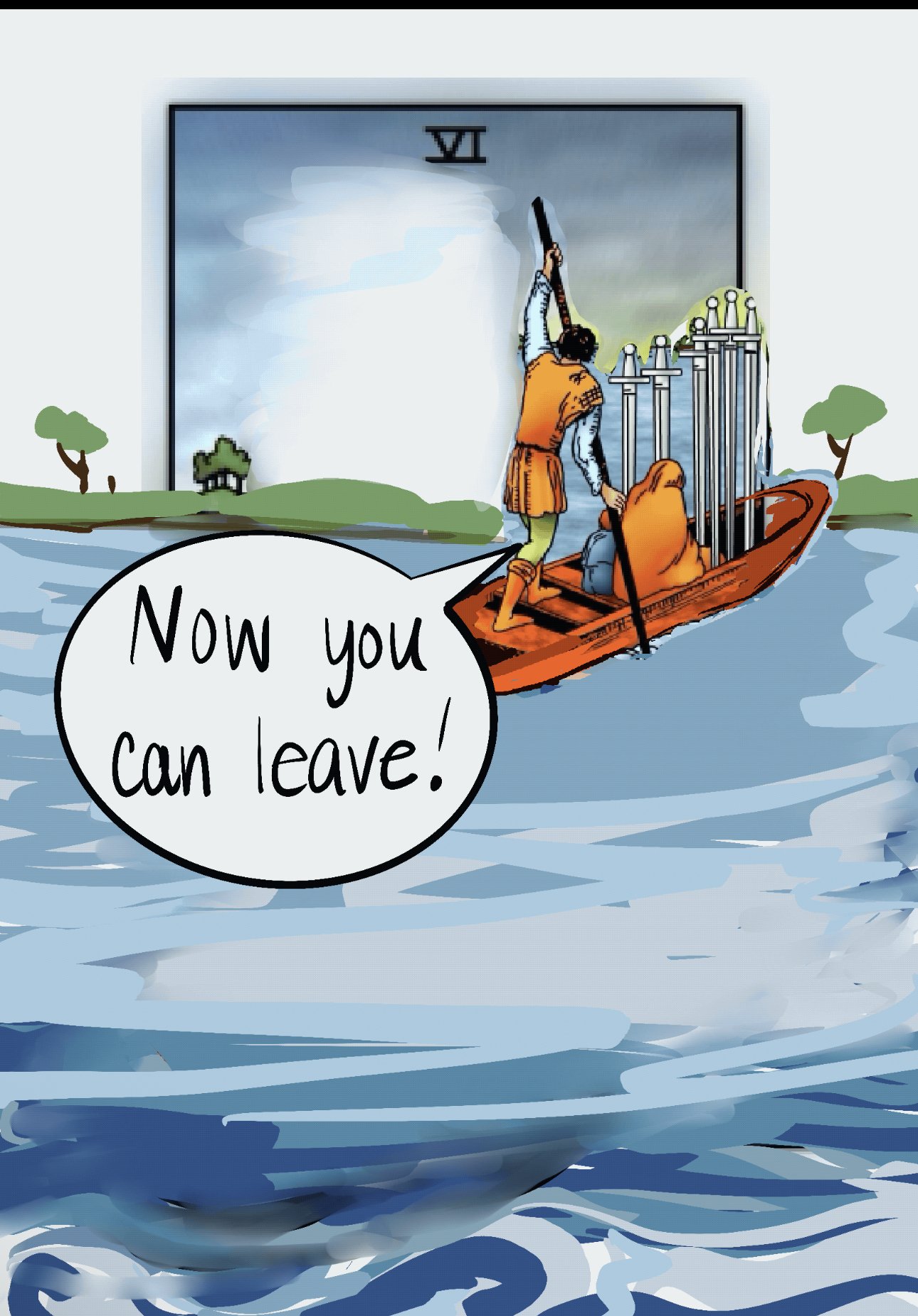 “Good” the Six of Swords says, “Now you can finally leave.”